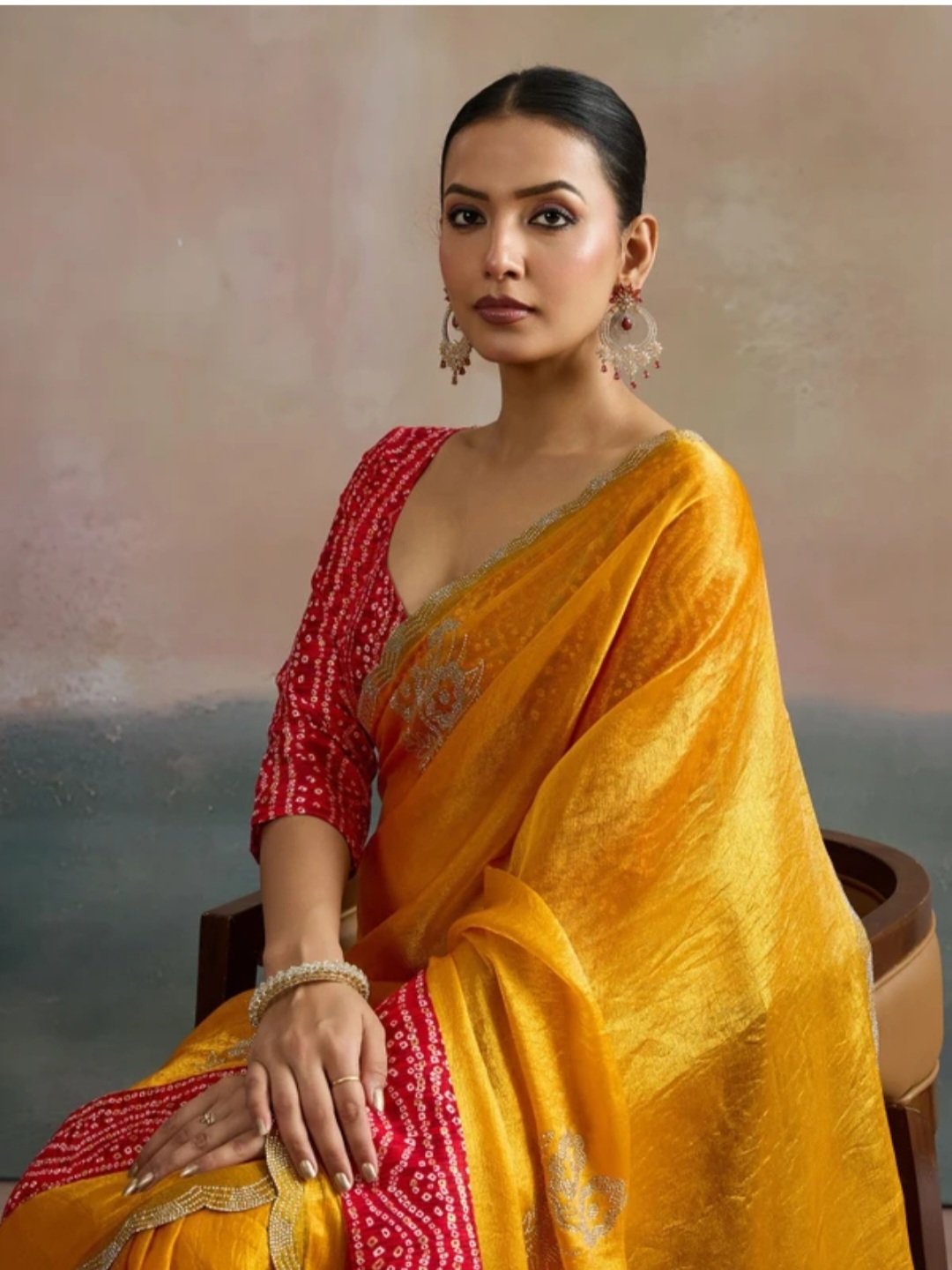 Woven bollywood Chiffon saree (yellow, Pink) .Bring out your elegant and glamorous side with this stunning Bollywood-style chiffon saree.